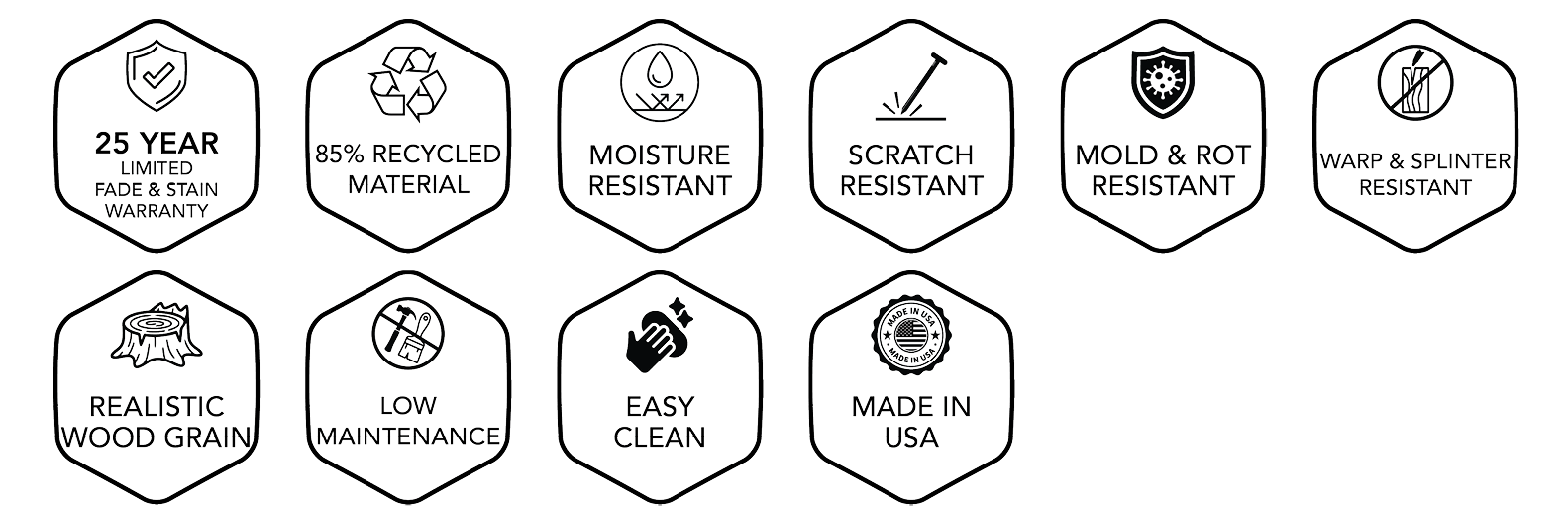 Fade Resistant,Mold Resistant,Scratch Resistant,Stain Resistant,Moisture Resistant,Sustainable,Low Maintenance,Splinter Resistant,Realistic Wood Grain